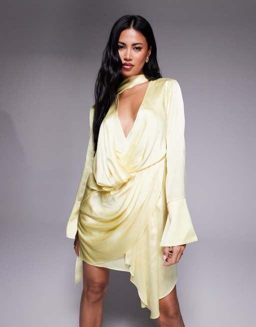 ASOS DESIGN – Langärmliges Minikleid aus Satin in Zitronengelb mit tiefem Ausschnitt mit drapiertem Schal und Wickelrock
