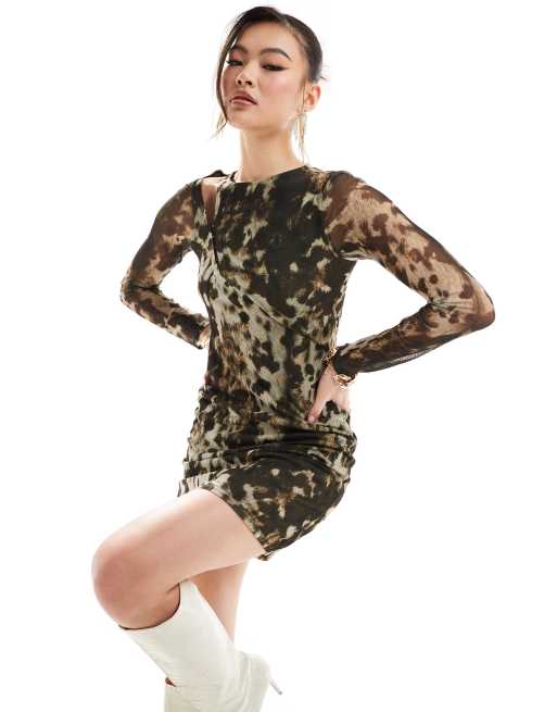 ASOS DESIGN – Langärmliges Minikleid mit braunem Kuhmuster und Schlitzausschnitt