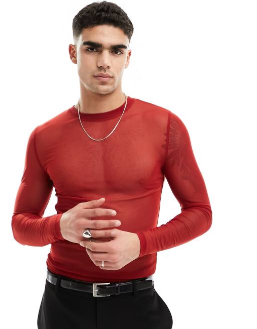 ASOS DESIGN – Langärmliges Muskelshirt in Rot aus Netzstoff
