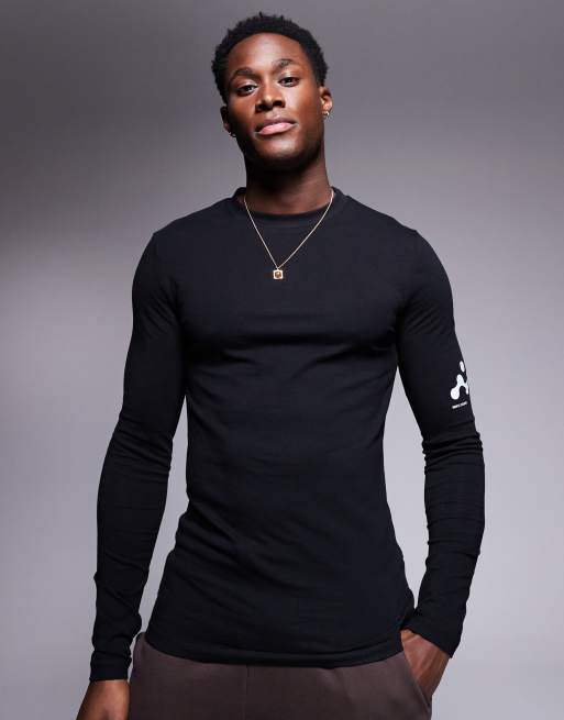 ASOS DESIGN – Langärmliges Muskelshirt in Schwarz mit Grafikprint am Ärmel
