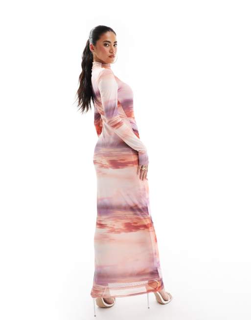 ASOS DESIGN – Langärmliges Netzstoff-Maxikleid mit Raffung und Aquarellmuster