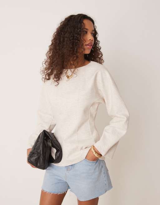 ASOS DESIGN – Langärmliges Oberteil aus Material in Neoprenoptik in Hellbeige mit Korsett-Taille