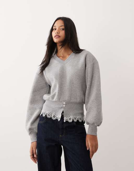 ASOS DESIGN – Langärmliges Oberteil in Grau mit Kragen, geraffter Taille und Spitzendetail