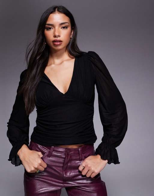 ASOS DESIGN – Langärmliges Oberteil in halbtransparentem Schwarz mit V-Ausschnitt