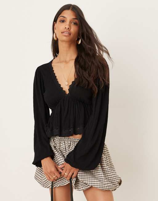 ASOS DESIGN – Langärmliges Oberteil in Schwarz mit Bindedetails hinten und Knitterstruktur