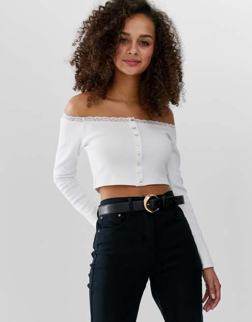 ASOS DESIGN – Langärmliges Oberteil mit Bardot-Ausschnitt, Knopfleiste vorne und Spitze in Weiß