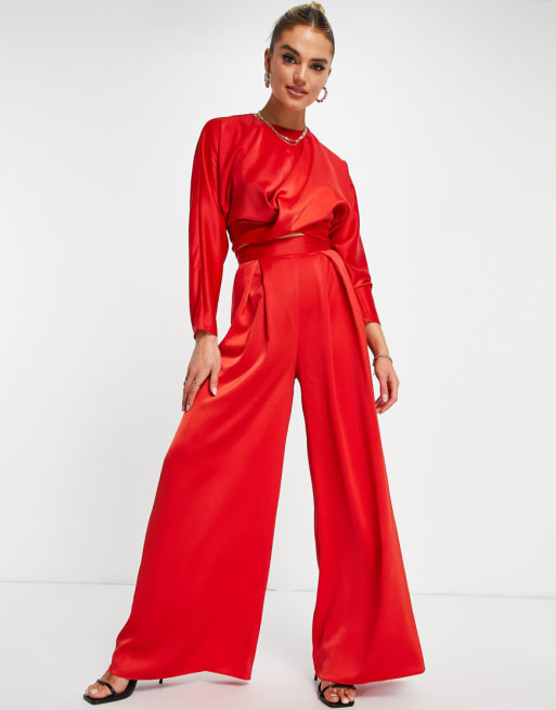 ASOS DESIGN – Langärmliges Oberteil mit Wickeldetail und Bindung vorne und Hose mit weitem Bein, Set