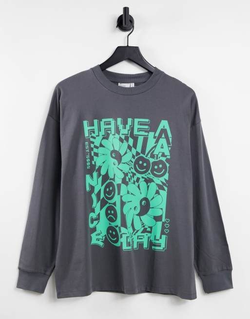 ASOS DESIGN – Langärmliges Oversize-Shirt in Anthrazit mit „Have a Nice Day“-Grafikprint