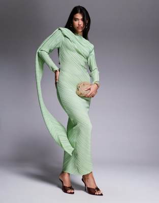 ASOS DESIGN – Langärmliges, plissiertes Maxikleid in Mintgrün mit Drapierung