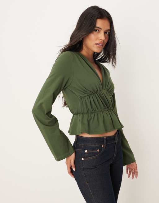ASOS DESIGN – Langärmliges Shirt in Khaki mit Rüschen