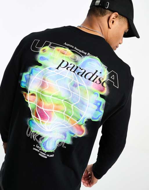 ASOS DESIGN – Langärmliges Shirt in Schwarz mit lockerem Schnitt und „Utopia“-Print