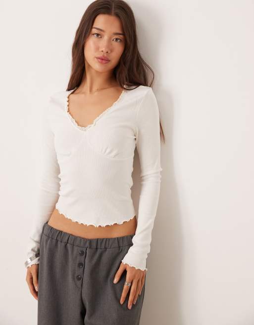 ASOS DESIGN – Langärmliges T-Shirt in Creme mit V-Ausschnitt und Spitze