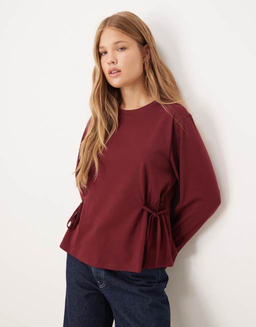 ASOS DESIGN – Langärmliges T-Shirt in dunklem Kirschrot mit geraffter Seite mit Schnürung