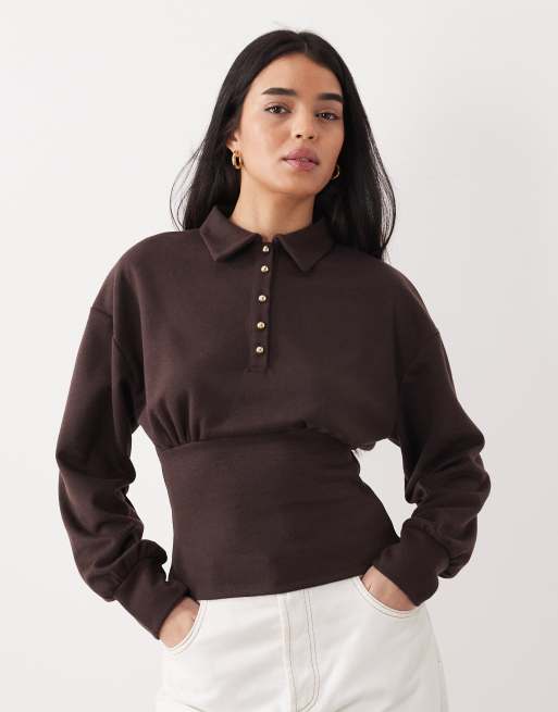ASOS DESIGN – Langärmliges, tailliertes Interlock-Oberteil in Schokobraun mit Knopfleiste