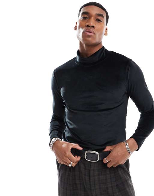 ASOS DESIGN – Langärmliges Velours-Shirt in Schwarz mit körperbetontem Schnitt und hohem Kragen