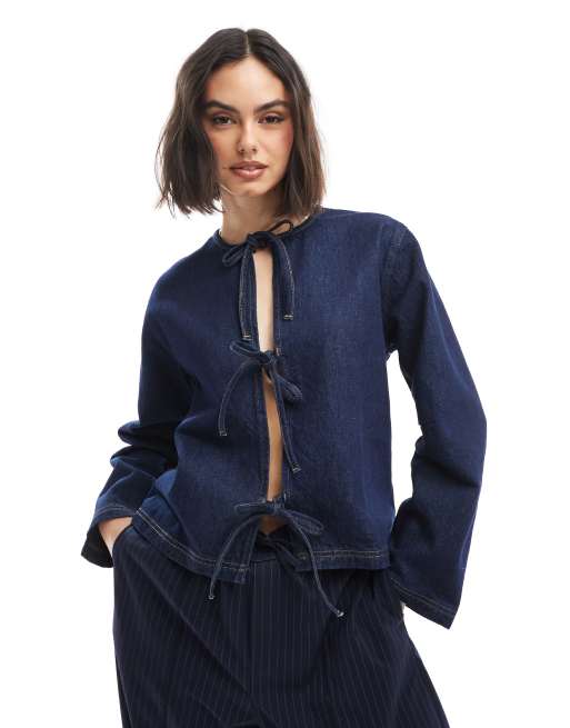 ASOS DESIGN – Langärmliges, vorne gebundenes Denim-Oberteil in Indigoblau mit Kontrast-Ziernaht