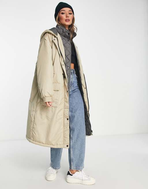 ASOS DESIGN – Langer, gesteppter Hybrid-Parka in Stein