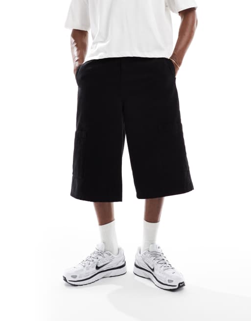 ASOS DESIGN – Längere Cargo-Schlupf-Shorts in Schwarz