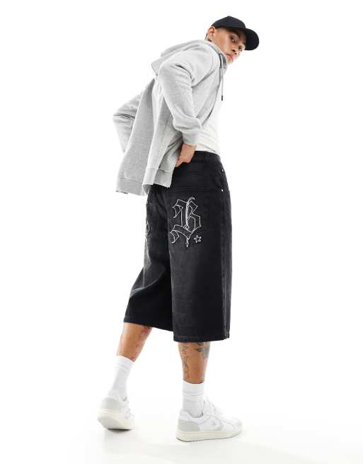 ASOS DESIGN – Längere Jeans-Jorts in verwaschenem Schwarz mit Aufnähern auf der Rückseite