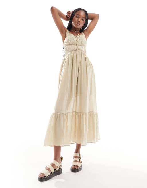 ASOS DESIGN – Langes Prärie-Sommerkleid in Taupe mit Raffung und Spitzenborte