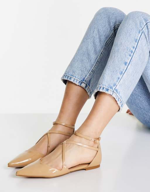 ASOS DESIGN – Larna – Spitze, flache Ballerinas in Beige Lackoptik