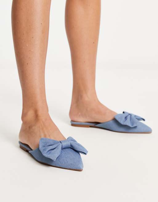 ASOS DESIGN – Lass – Spitze flache Mules in Jeansblau mit Oversize-Schleife
