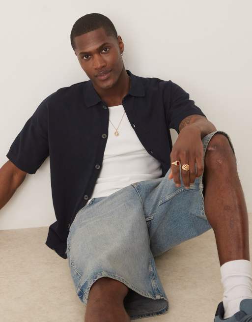 ASOS DESIGN – Lässiges Polohemd aus leichtem Baumwollstrick in Marineblau mit Knopfleiste