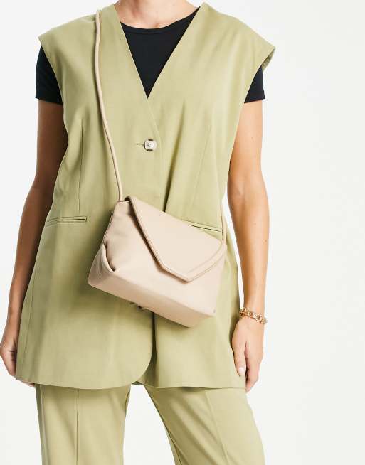 ASOS DESIGN – Leder-Umhängetasche in Beige mit Umschlag-Design und runder Paspelierung