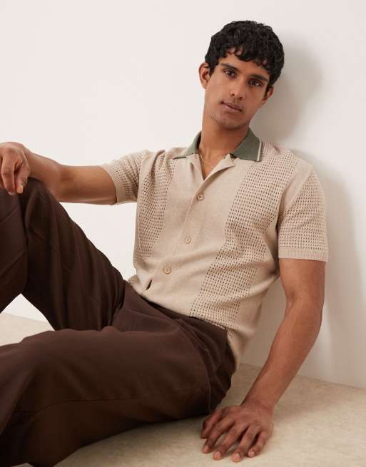 ASOS DESIGN – Legeres Strick-Poloshirt in Beige mit Knopfleiste, kontrastierendem Kragen und kastigem Schnitt