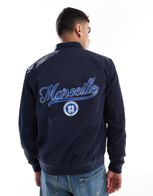 ASOS DESIGN – Leichte Bomberjacke in Marineblau mit Print