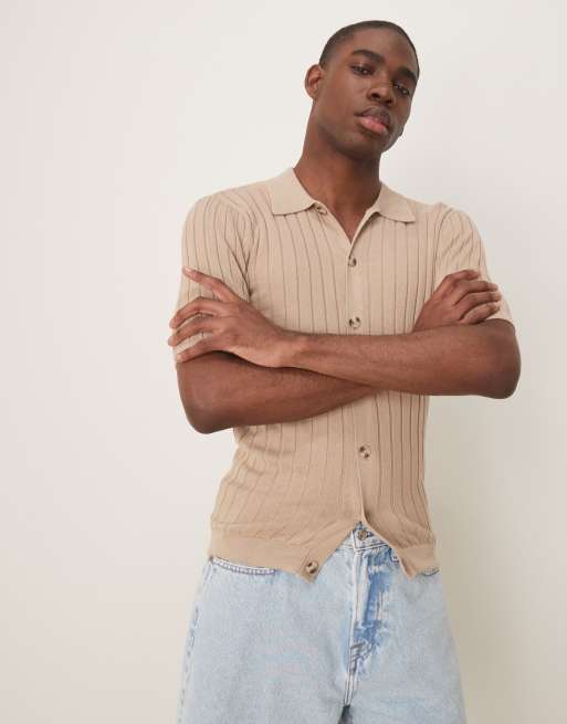 ASOS DESIGN – Leichtes Polohemd aus Rippstrickin Steinbeige mit durchgehender Knopfleiste