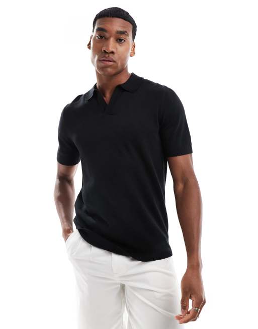 ASOS DESIGN – Leichtes Strick-Polohemd aus schwarzer Baumwolle mit eingekerbtem Ausschnitt