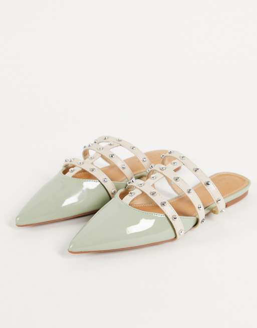 ASOS DESIGN – Liquorish – Mit Nieten besetzte, flache Pantoletten mit Lackoptik in Mint
