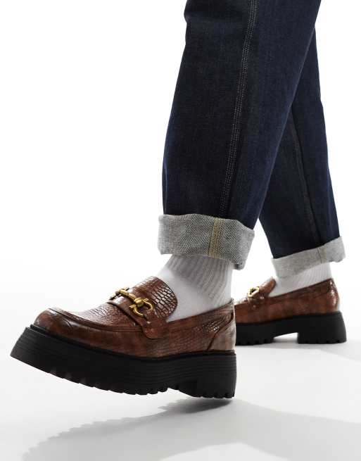 ASOS DESIGN – Loafer aus Kunstleder in Kroko-Braun mit dicker Sohle und Trense