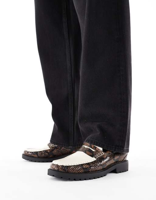 ASOS DESIGN – Loafer in braunem Schlangenleder-Imitat mit kontrastierender Blatte und Stollensohle