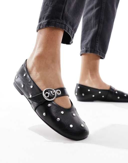 ASOS DESIGN – Locke – Premium – Mary-Jane-Ballerinas in Schwarz aus Leder mit Nietenbesatz