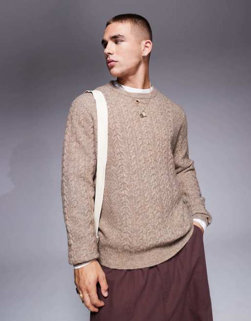 ASOS DESIGN – Locker geschnittener, weiter Strickpullover in Steinbeige mit Zopfmuster und Rundhalsausschnitt