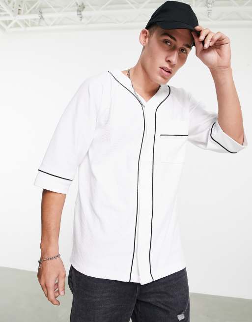 ASOS DESIGN – Locker geschnittenes Baseball-Hemd in Creme mit Waffelstruktur und kontrastierender Paspelierung in Schwarz