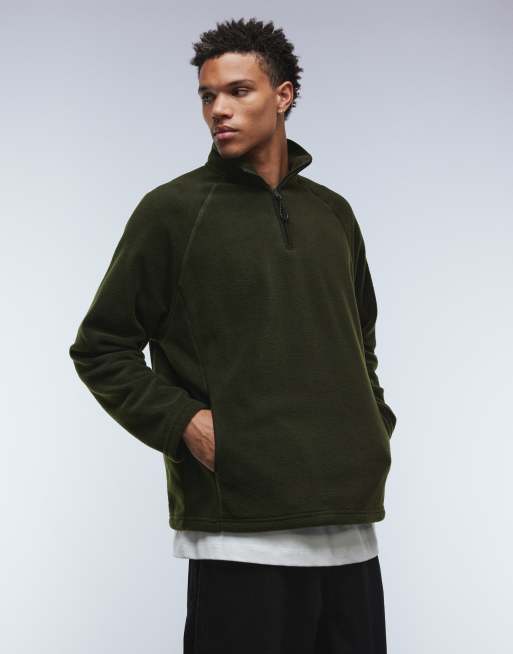 ASOS DESIGN – Locker geschnittenes Fleece-Sweatshirt in Khaki mit Stehkragen und kurzem Reißverschluss