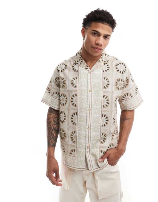 ASOS DESIGN – Locker geschnittenes Hemd in Steinbeige mit geometrischem Muster und Reverskragen