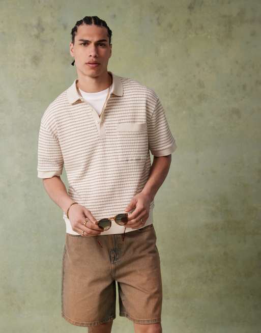 ASOS DESIGN – Locker geschnittenes, kastiges Poloshirt mit Strukturstreifen in Weiß und Braun