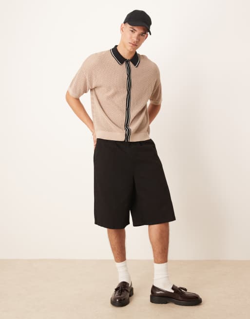ASOS DESIGN – Locker geschnittenes Polohemd aus Airtex-Material in Steinbeige mit Knopfleiste und Kontrast-Kragen