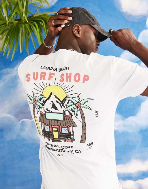 ASOS DESIGN – Locker geschnittenes T-Shirt in Blau mit Surfing-Cartoonprint auf Brust und Rücken