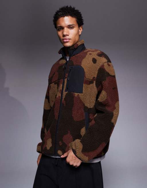 ASOS DESIGN – Locker geschnittenes Teddyfell-Sweatshirt in Braun mit Stehkragen, durchgehendem Reißverschluss, Tasche und Military-Muster