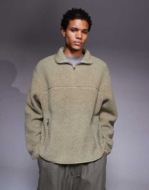 ASOS DESIGN – Locker geschnittenes Teddyfell-Sweatshirt in Steinbeige mit kurzem Reißverschluss und Stehkragen