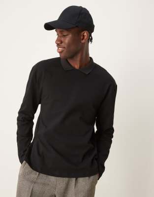 ASOS DESIGN – Lockeres, langärmliges Hemd in Schwarz mit Rundhalsausschnitt und Polokragen
