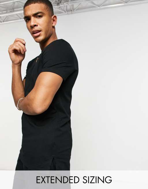 ASOS DESIGN – Longline-T-Shirt aus Baumwollmix in Schwarz mit Rundhalsausschnitt und seitlichen Schlitzen - BLACK
