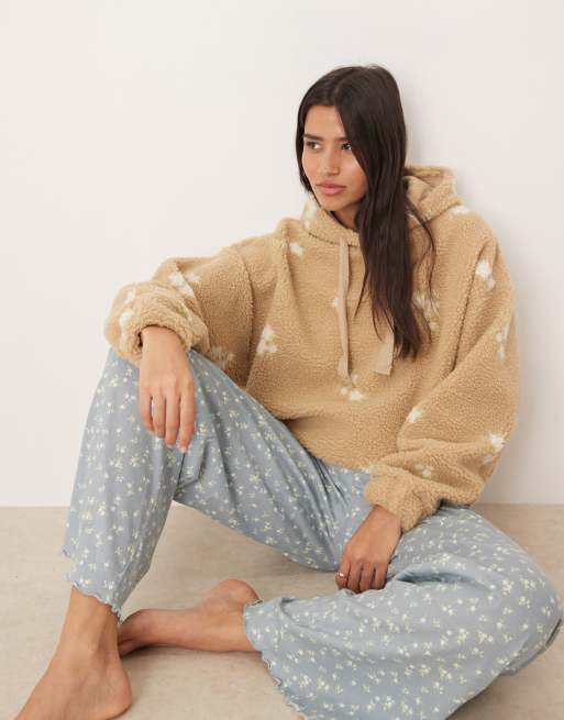 ASOS DESIGN – Lounge-Kapuzenpullover aus Teddyfell mit Blümchenmuster und Oversize-Schnitt