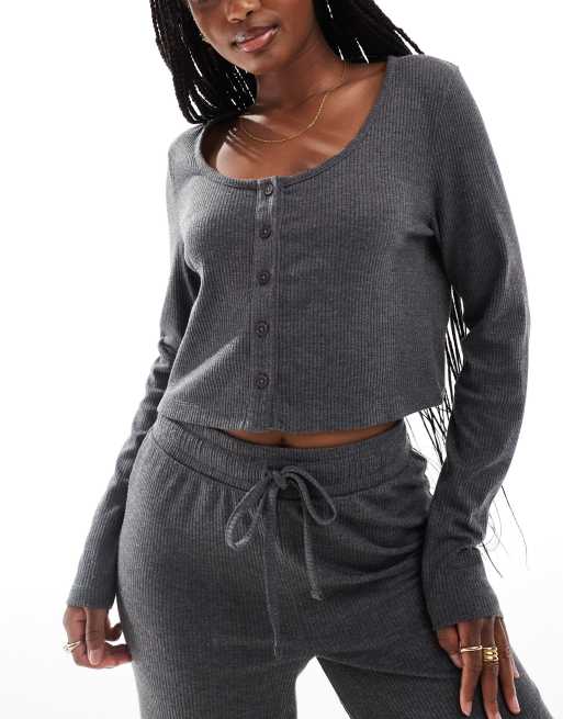 ASOS DESIGN – Lounge – Mix and Match – Geripptes Langarm-Oberteil in Grau mit Knopfleiste