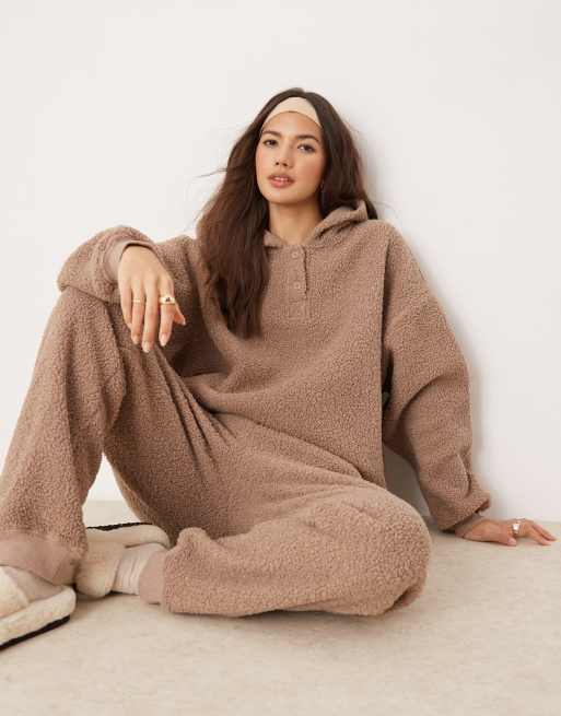 ASOS DESIGN – Lounge-Set aus Teddyfell in Taupe, mit Oversize-Kapuzenpullover und Jogginghose